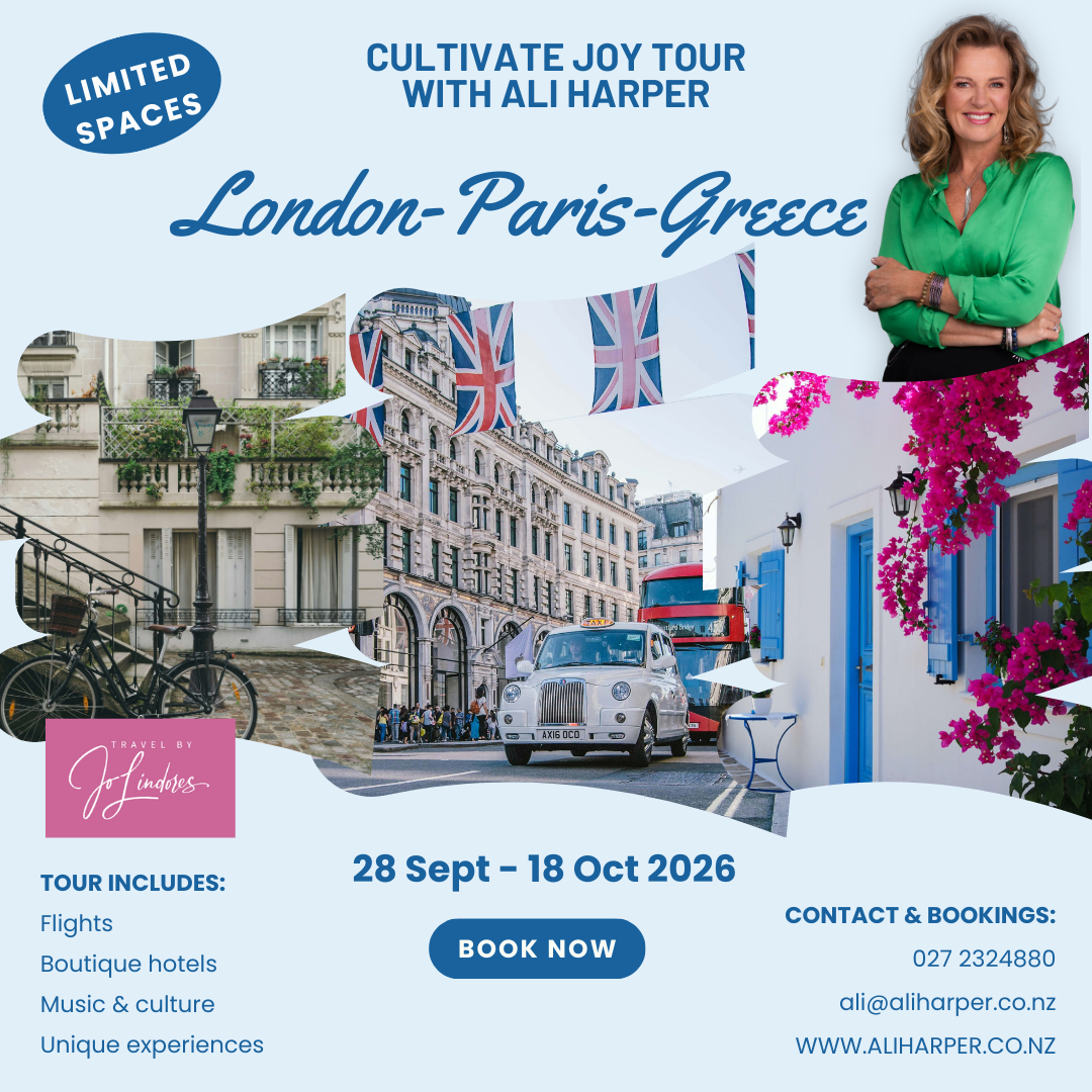 Join Ali Harper on a joyful, sensory-rich journey through London, Paris, and Greece. Begin with her live event in London, then explore charming neighbourhoods, hidden gems, and stunning scenery that most travellers miss. This uplifting, unique tour blends beauty, connection, and discovery, guided by Ali.